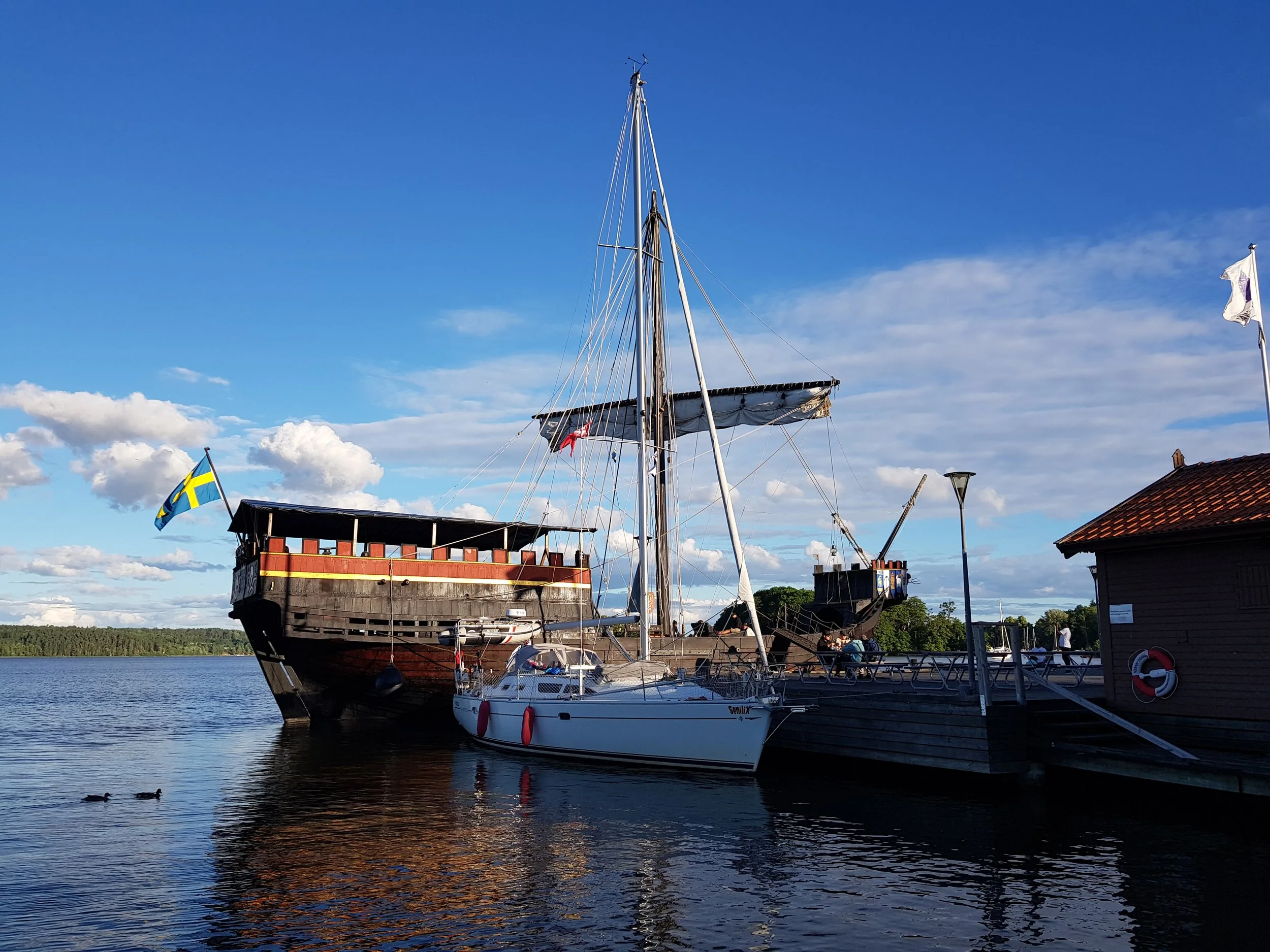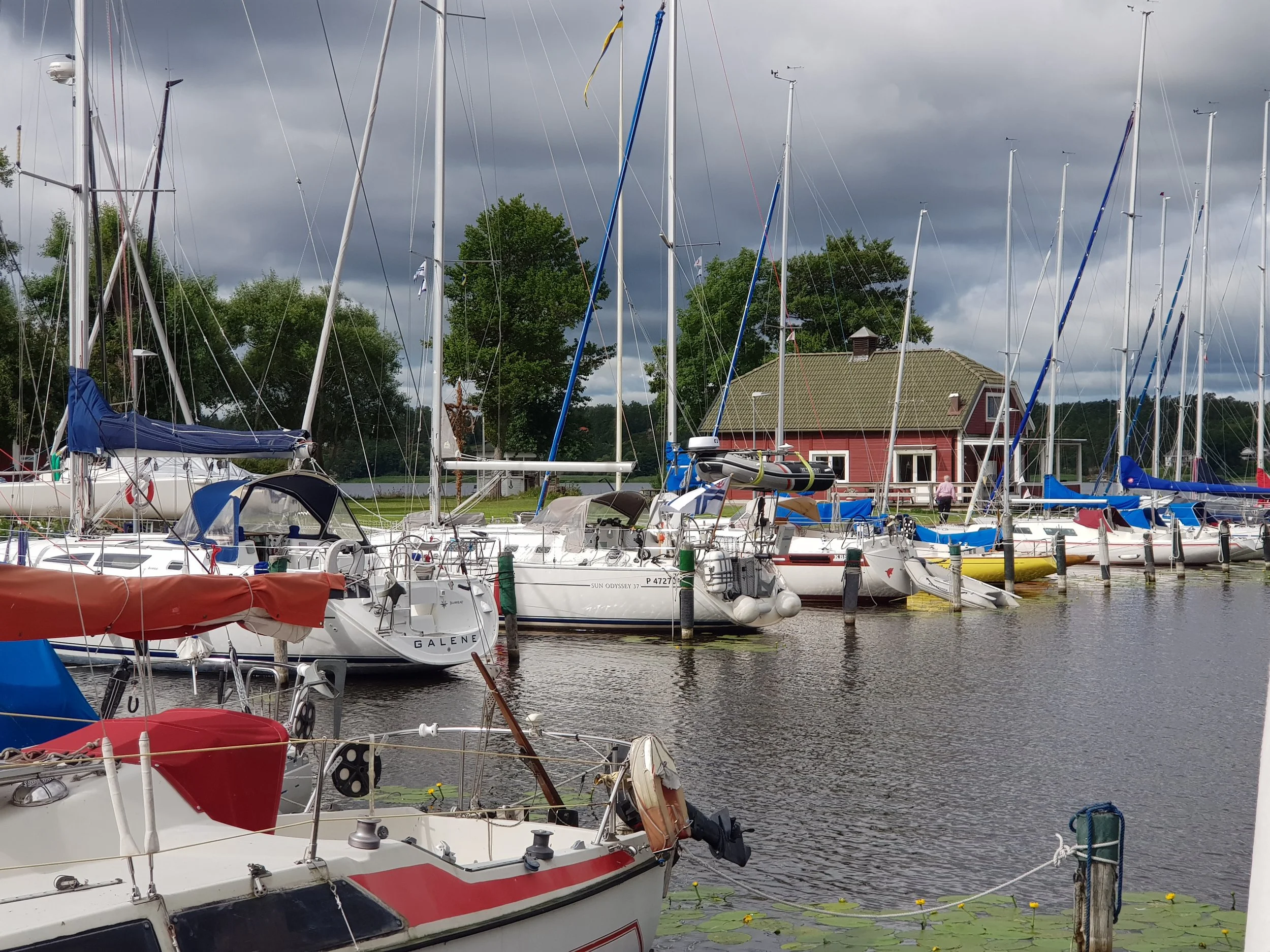 Skarholmen är centrum för båtlivet i norra Mälaren, men där var inte direkt nån rusning. Finns inga dedikerade gästplatser utan hamnkaptenen delar ut platser som den dagen är tomma. Här var det betalning med Swich som gällde. Det är en mobilbetalning som nästan alla har och använder. Jättesmidigt, men kräver att man har ett svenskt abonnemang och bankkonto. Som tur hade vi en kollega på besök i båten som kunde swicha.