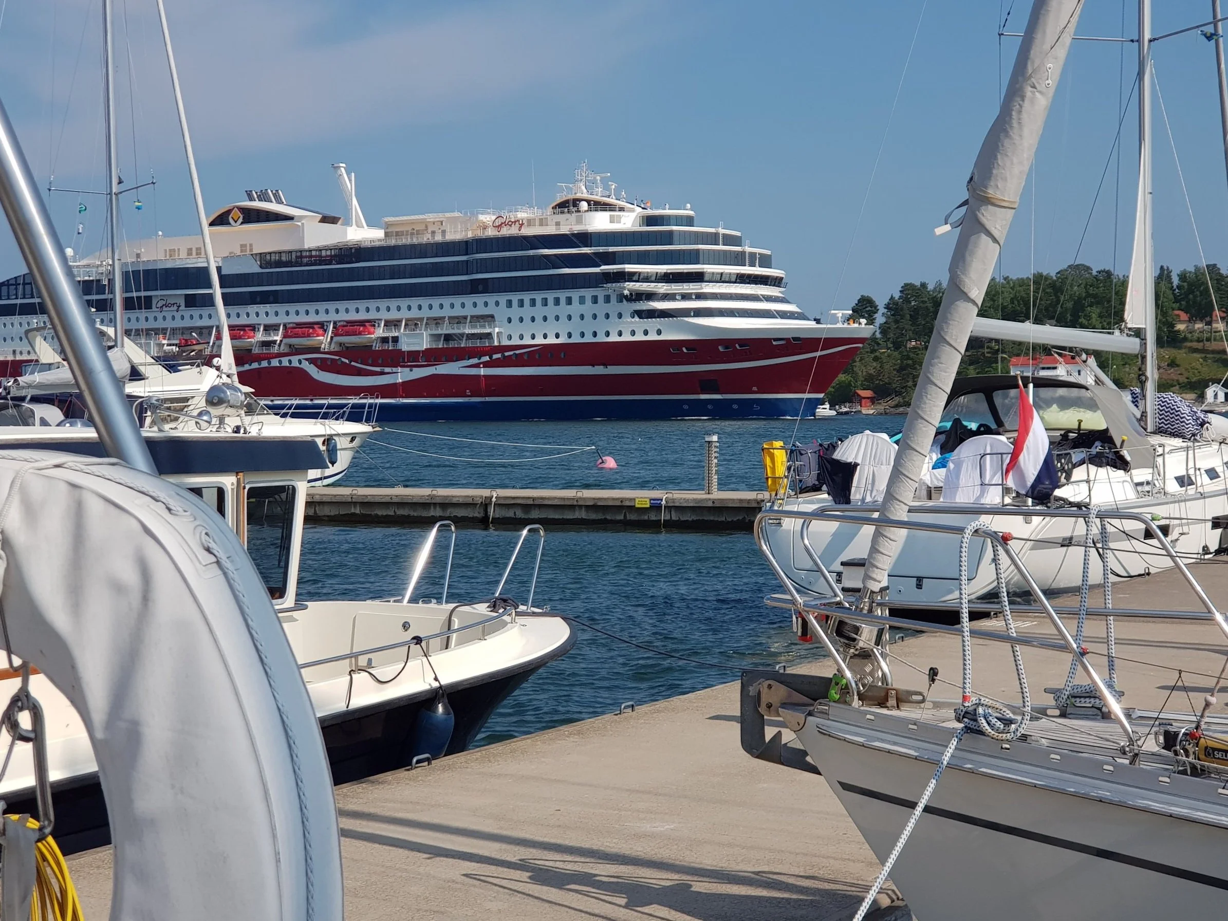 När vi kom ut på det fria i Saltsjön tog vi sikte på Wasahamnen. Vi körde in i hamnen precis när det började ösregna. Inte en ledig plats nånstans. De enda lediga platserna var ytterom den flytande vågbrytaren i svallet från alla Vaxholmsbåtarna. Vi lyckades lägga till utan skavanker, men 8 fendrar i sidoförtöjning var nog inte tillräckligt. Regnet slutade och i samma veva var det flera båtar som lämnade hamnen. Supersnabb förflyttning in i hamnen igen. Vi kom in som nummer två och lyckades få en bra plats. Några minuter senare var det fullt igen. Vi tog en båt från Holland utan på vår tills de hittade plats. Det var visst förbjudet enligt skyltar på svenska, men just då förstod vi bara finska och engelska.
