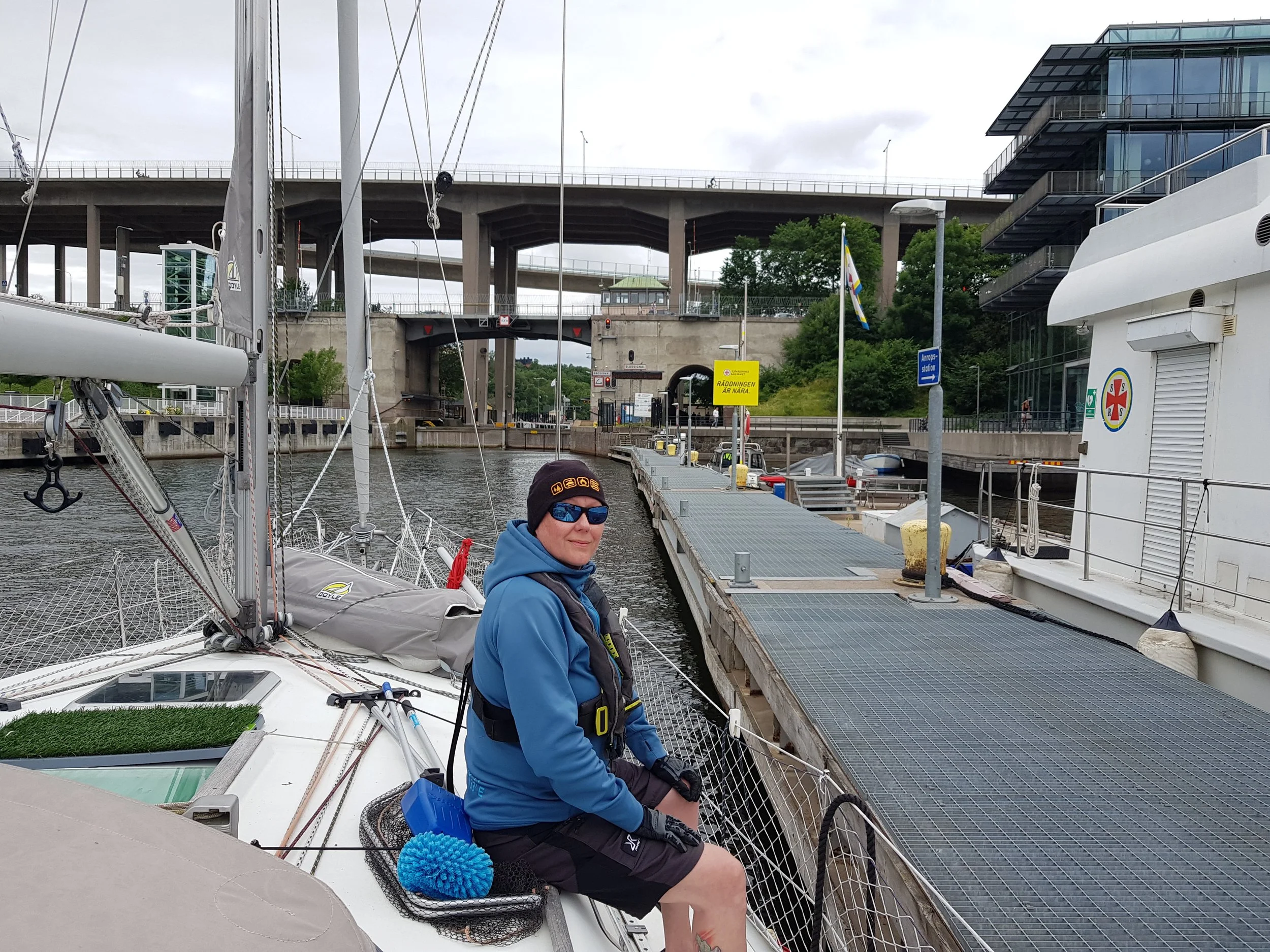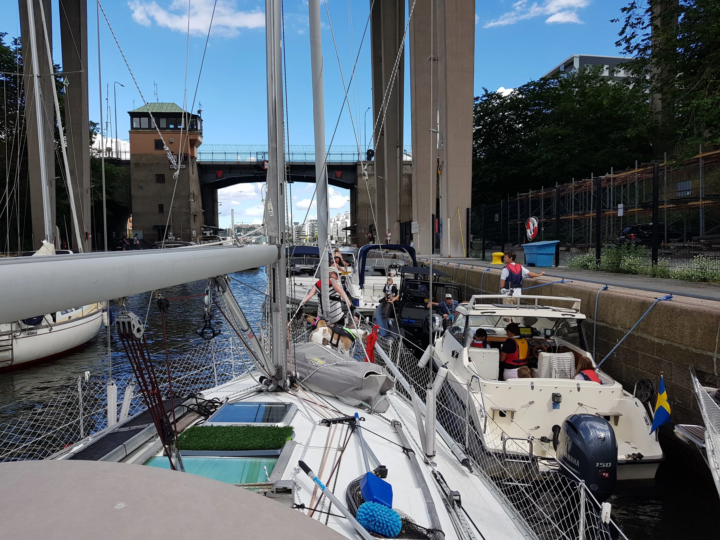 Bredvid Vikingline terminalen är Danviksbron som öppnar en gång per timme. Därifrån kommer man in till Hammarby sjöstad och Hammarby slussen. Slussen har också bro som öppnas vid behov. Till Mälaren kommer man in med ca 25m hög mast. Vi var bara ett par båtar som slussade in så det gick hur enkelt som helst. Skillnaden i vatten-nivå mellan Saltsjön och Mälaren är liten så man märker knappt om man åker upp eller ner.